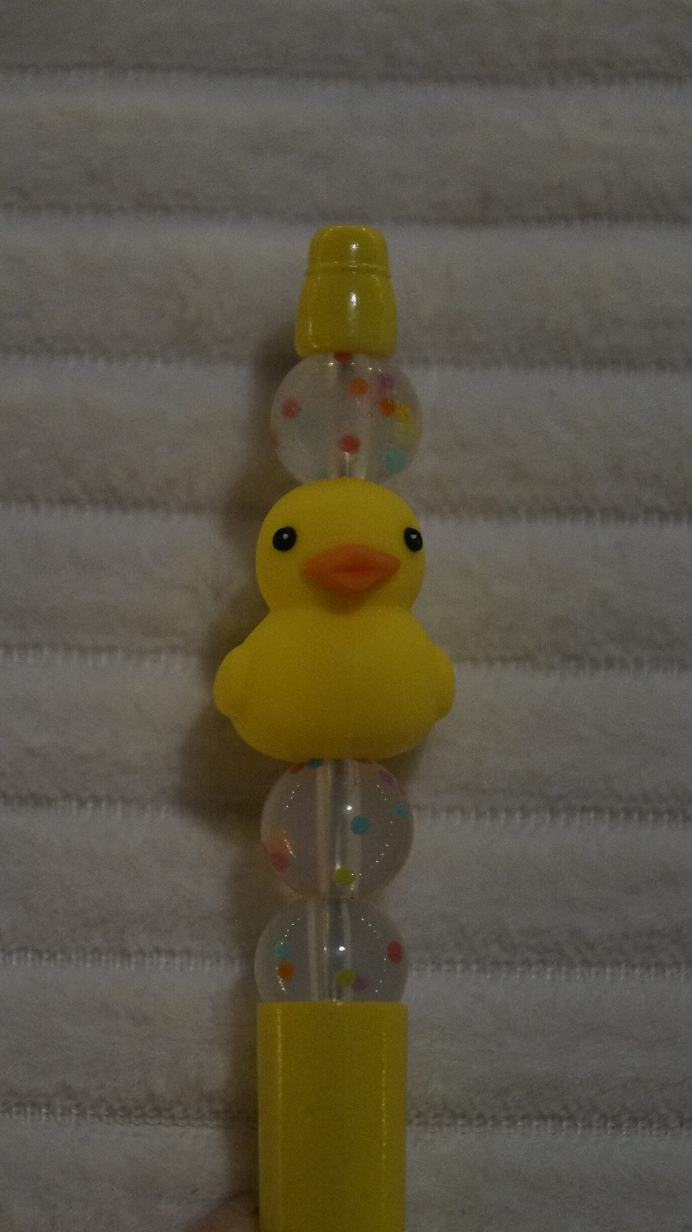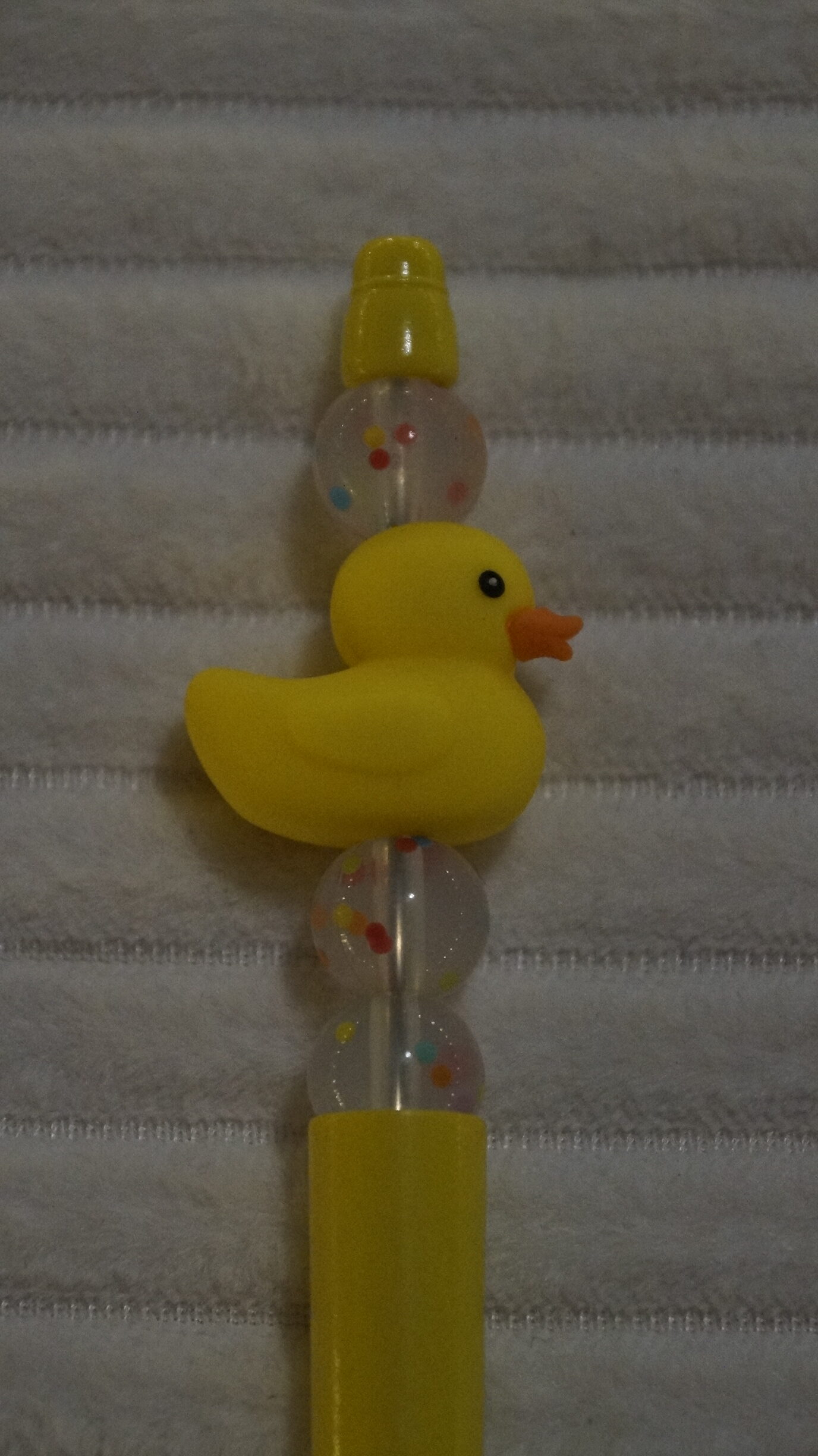 Een glitterende gele pen met vrolijke confettie en een badeendje.