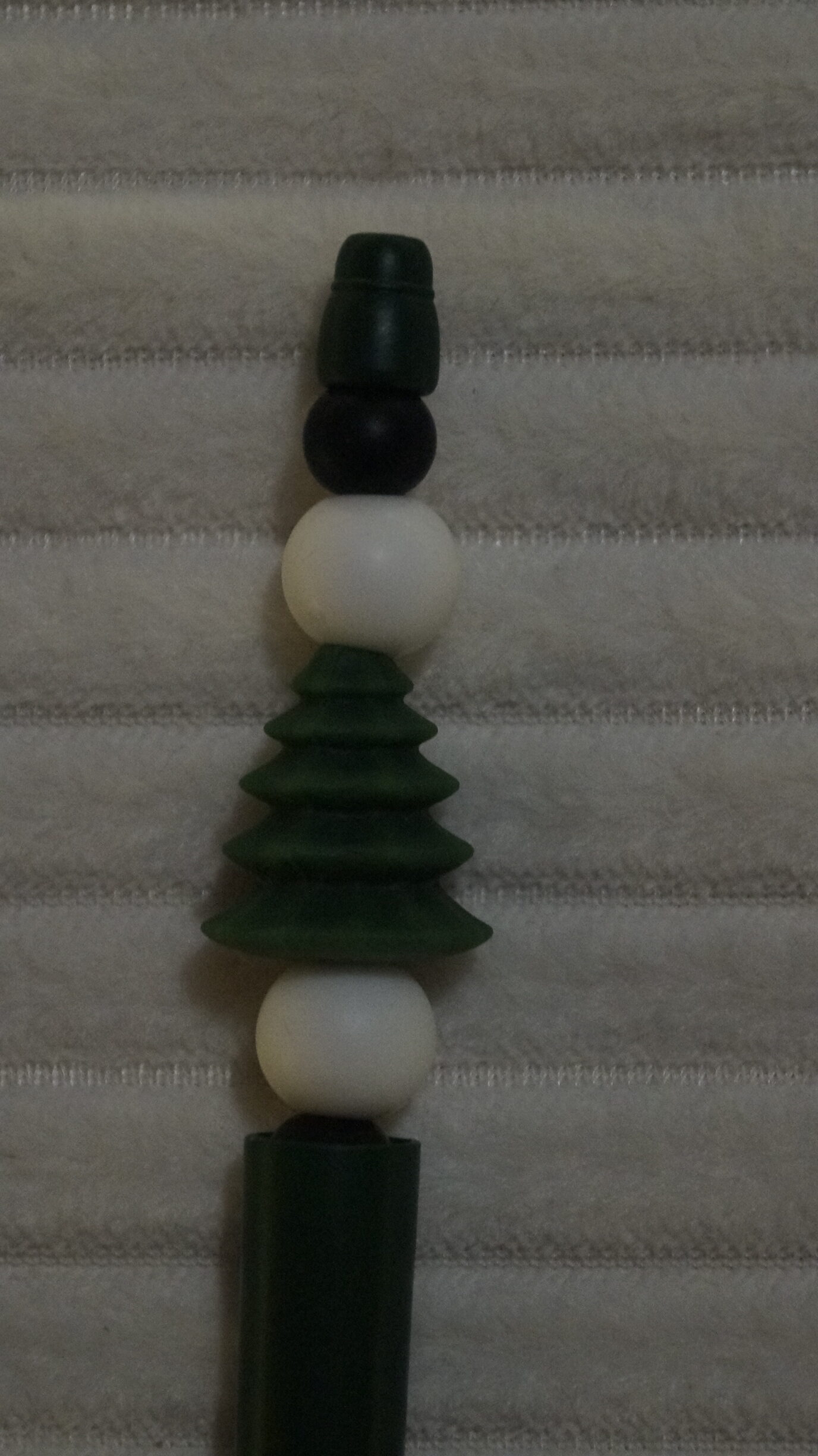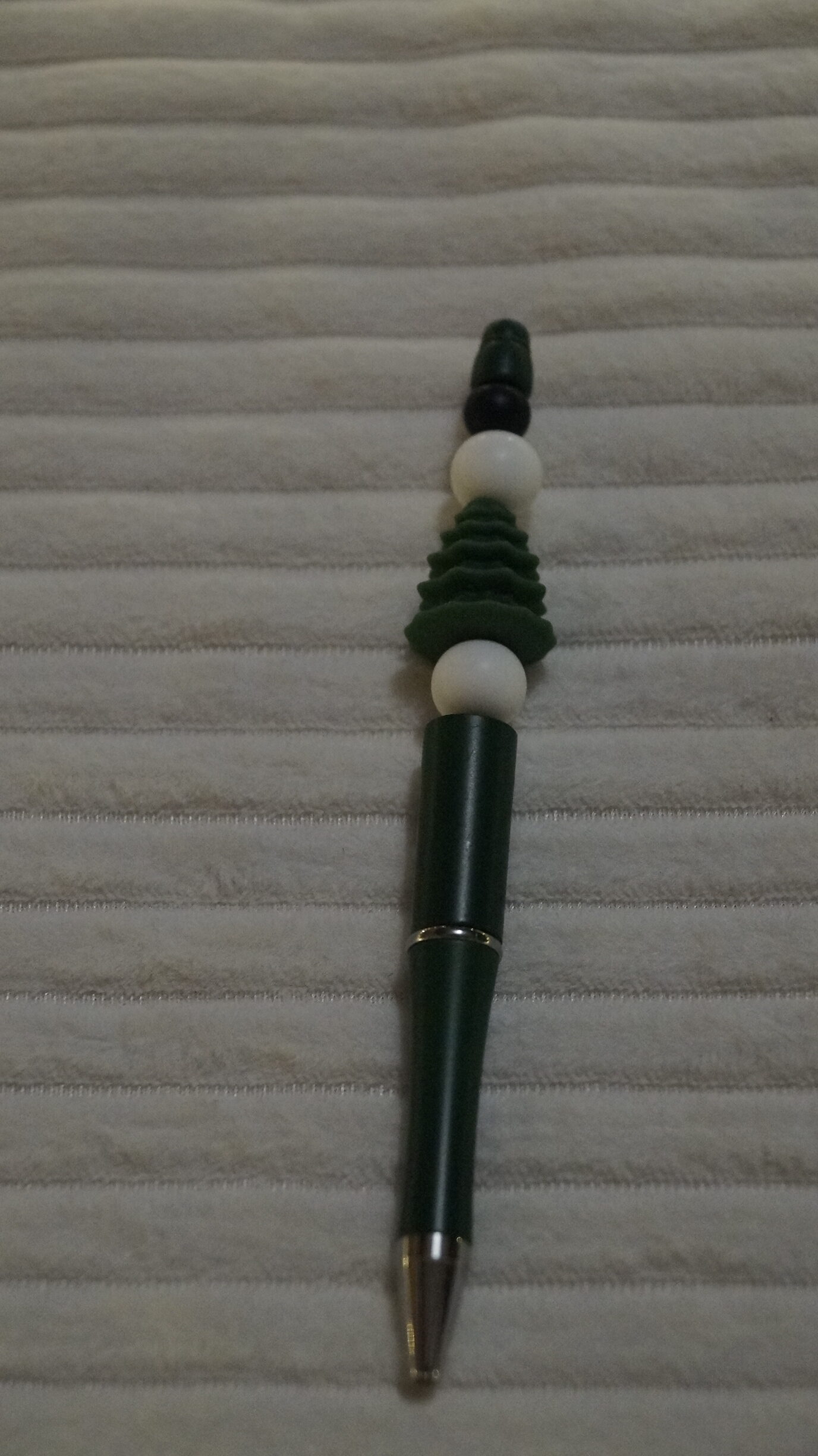 Een pen in winterse sferen met een groene kerstboom. Help deze pen jou door je stapel kerstkaarten heen?