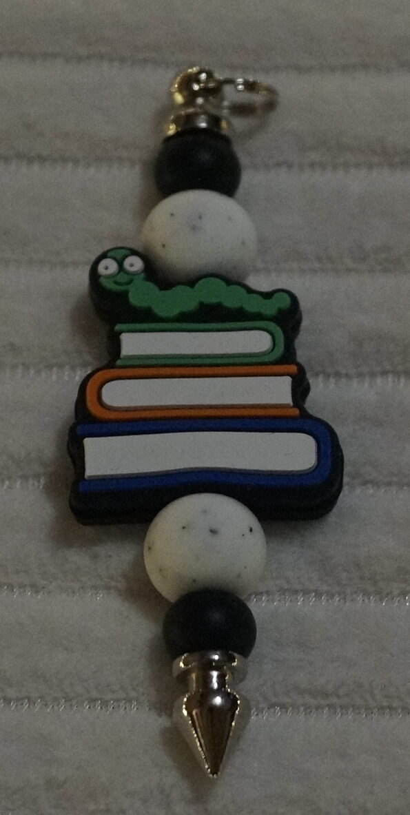 Een boekenwurm gaat nergens heen zonder boek, in welke vorm dan ook. Deze sleutelhanger is een lief gezelschap met een wurmen vriendje en zijn stapel boeken.