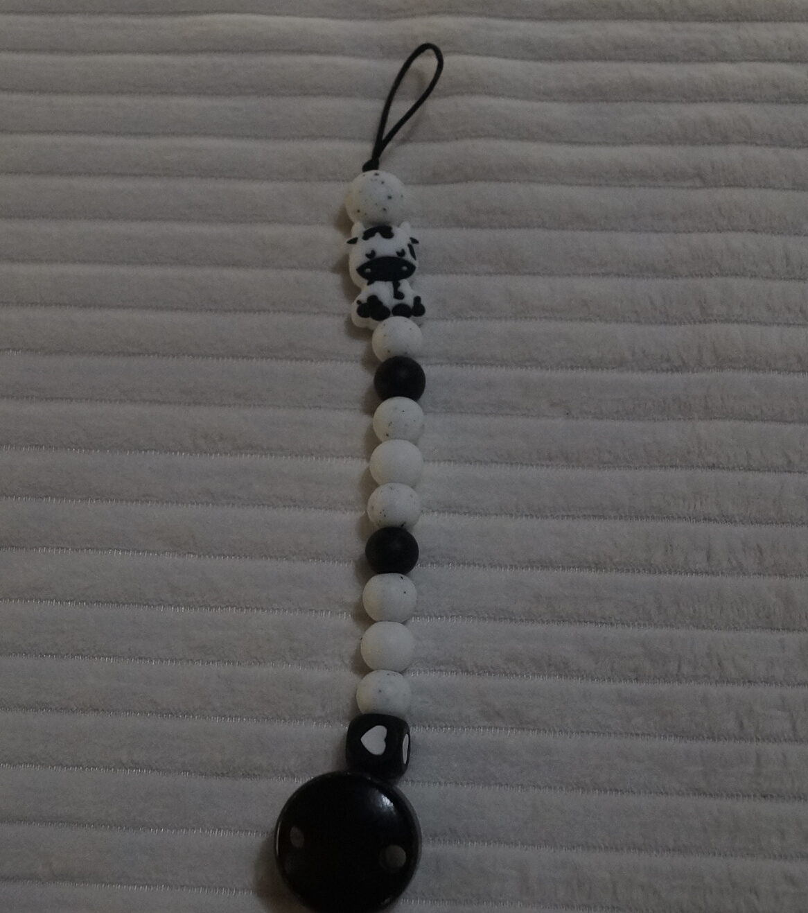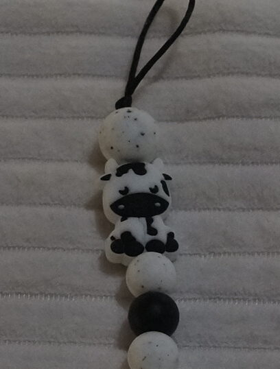 Een handig speenkoord met een vrolijke koe die toezicht houd zodat de fopspeen niet verdwijnt.